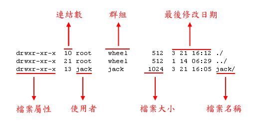 ls 这个指令是用来列出档案的信息,选项 -l 表示列出详细信息,选项 -d 表示只列出目录本身而不列出目录下的档案,而最后的二个参数则是我们要列出的档案或目录。