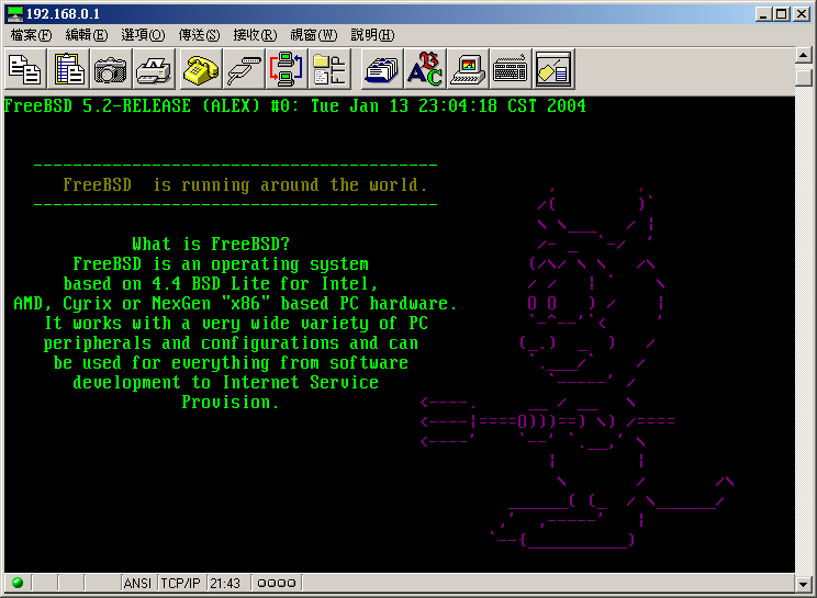 我们在这里要做的就是把它改成想要的样子。更改 login 前的画面有二种方式,一种是修改 /etc/gettytab 及 /etc/issue,另一种方式是修改 telnetd。