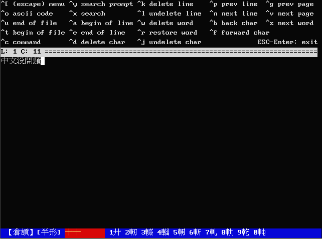 安装完后,先执行 rehash 来更新一下 tcsh 指令的快取,之后我们就可以使用指令 b5c 来出现像 DOS 下倚天中文的环境,如图 3-7。