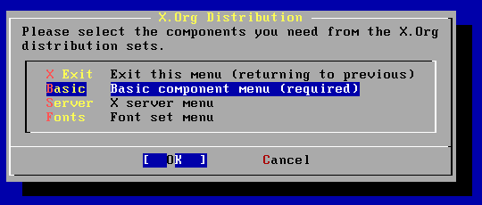 在安装 FreeBSD 时,我们应该己经选择要安装 X Windows 套件,如果您安装 FreeBSD 时并未安装该套件,您可以在开机后执行 sysinstall 来进入安装时的选单。进入安装画面后,选择 [Configure]->[Distributions]->[X.Org],如图 11-1 所示。