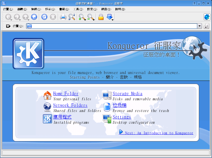 在 KDE3 中有许多的附属软件,从简单的文字编辑器、绘图软件,到常用的办公室软件、浏览器及邮件软件都有。由于是图形接口,您可以自行摸索尝试。KDE 的浏览器是 Konqueror,它的使用接口和 IE 差不多,除了是网页浏览器外,也结合了档案总管的功能,下图即 Konqueror 的画面: