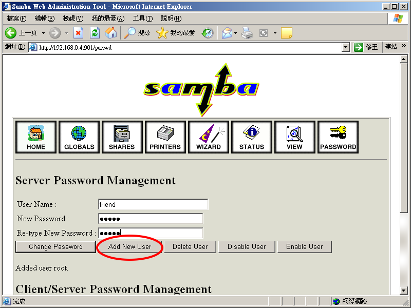 使用者 friend 必须是系统中的使用者,否则您必须使用 adduser 或 vipw 建立使用者。建立之后就可以在上图中 User Name 中输入 friend 并密码。这个功能取代了使用 smbpasswd -a 来建立账号的功能。