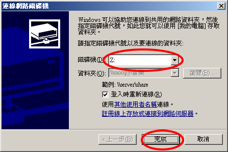我们可以使用 Windows 的联机网络磁盘驱动器功能,将一个共享数据夹变成系统中的网络硬盘。例如,将共享数据夹变成 Z: 磁盘驱动器。如果您点选该网络磁盘驱动器,并查看内容,您会看到它的档案系统格式为 NTFS,如下图所示: