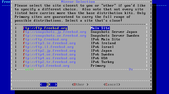 根据 第 3.9.2 节 配置了网络连接后, 即可开始选择像站点。 镜像站点上缓存有 FreeBSD 的安装文件, 选择一个更近的镜像站点有助于更快的获取这些文件, 从而减少安装时间。