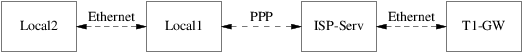 主机 Local1 和 Local2 在您那边。Local1 通过 PPP 拨号连接到了 ISP。这个 PPP 服务器通过一个局域网连接到另一台网关机子——它又通过一个外部接口连接到 ISP 提供的互联网上。