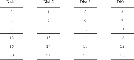 另外一种影射方法是把地址空间分布在比较小的容量相同的磁盘上, 从而能够在不同的设备上存储它们。例如,前256 个扇区可能存储在第一 个磁盘上,接着的256 个扇区存储在另一个磁盘上等等。 写满最后一个磁 盘后,进程会重复以前的工作,直到所有的磁盘被写满。这个影射叫做 分段(striping) 或者 RAID-0 [1]. 分段要求很精确地寻址,通过多个磁盘进行数据传输的时候,它 可能会引起额外的I/O 负载,但它也可能提供更多的连续负载。 图 22-2 显示了用分段形式分配的存储单元的顺序。