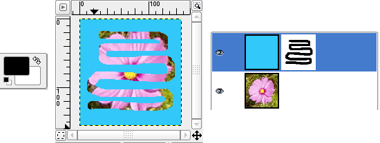 This image has a background layer with a flower and another blue one, fully opaque. A white layer mask has been added to the blue layer. In the image window, the blue layer remains visible because a white mask makes layer pixels visible.